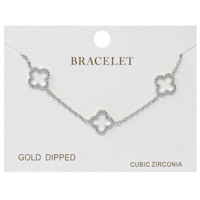 This elegant white gold–dipped bracelet features a delicate three-clover charm CZ design that symbolizes luck and timeless style. Crafted with a polished finish, it offers a refined yet effortless look that’s perfect for everyday wear or layering with other pieces. Lightweight and comfortable, this bracelet adds a subtle touch of charm and sophistication to any outfit.