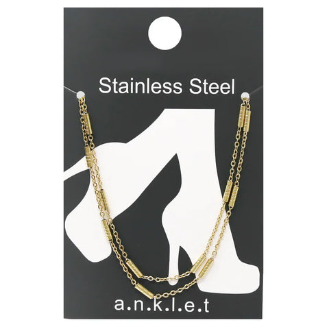 This stainless steel anklet features a double strand design for a sleek yet durable look. It is finished with a lobster clasp closure and measures 9.25 inches in length with a 2-inch extender for an adjustable, comfortable fit.